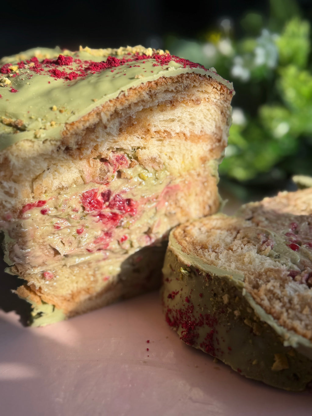 Ingrediente: Făină, zahăr, ouă, lapte, unt, drojdie, cremă de fistic (fistic, zahăr, ulei vegetal), zmeură proaspătă, smântână, sare, arome,nucă,fistic