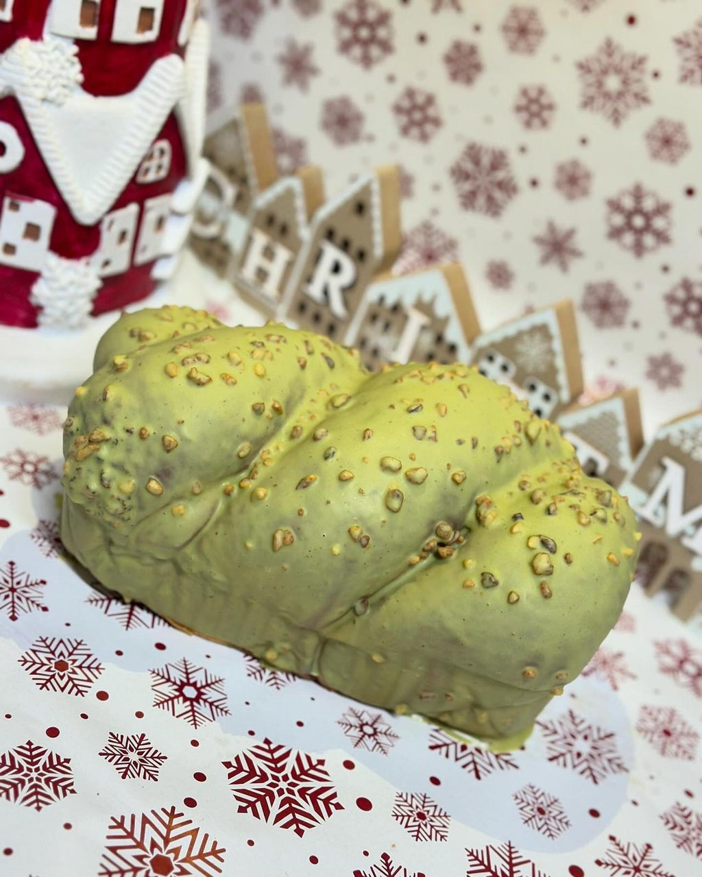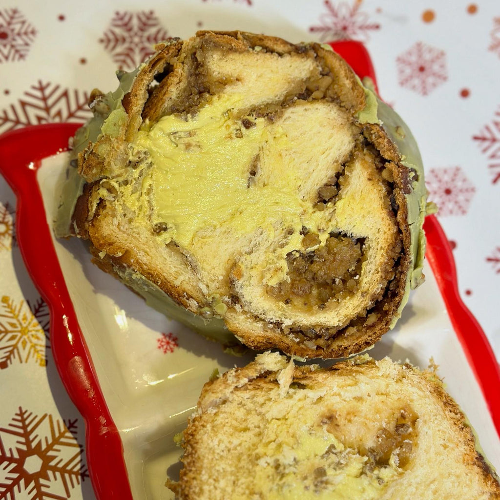 Cozonac delicios cu nuca si fistic si insertie de crema intensa de fistic.