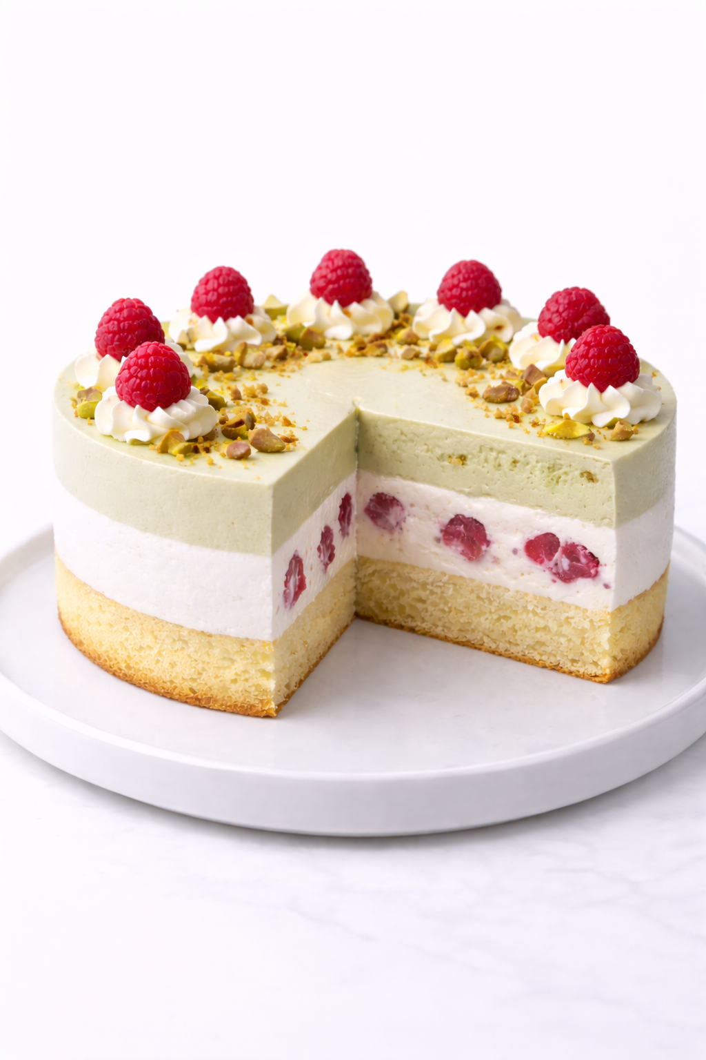 Tort cu blat de vanilie insiropat, mousse de fistic cu bucati crocante,mousse de ciocolata alba cu zmeură.